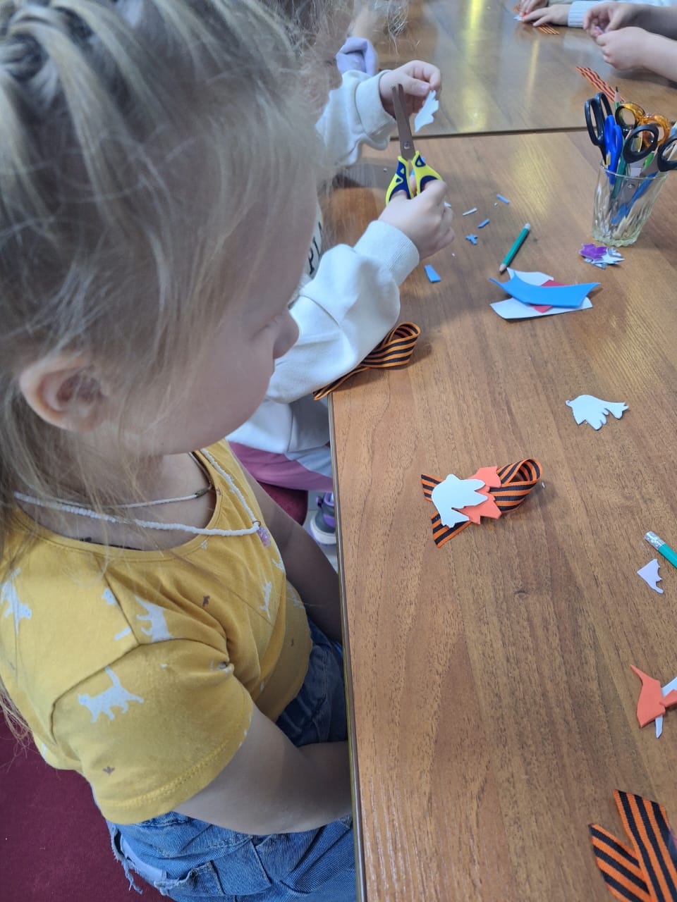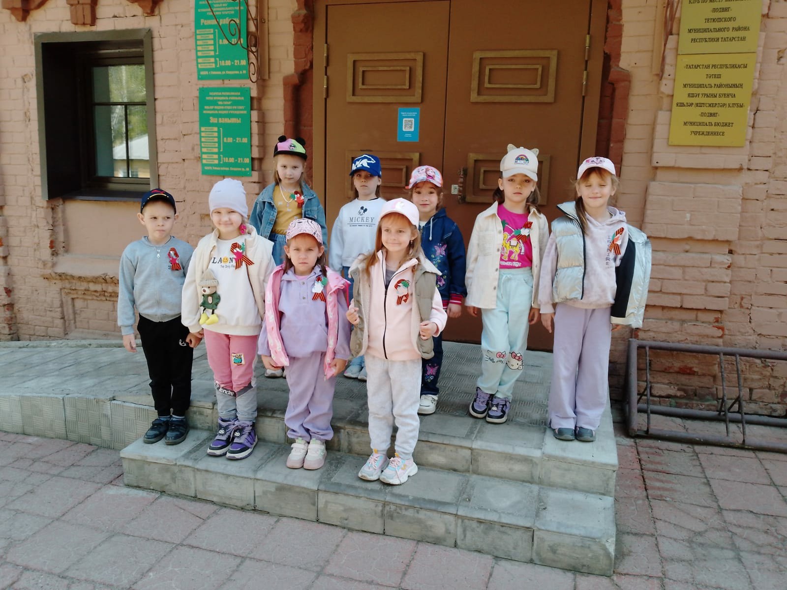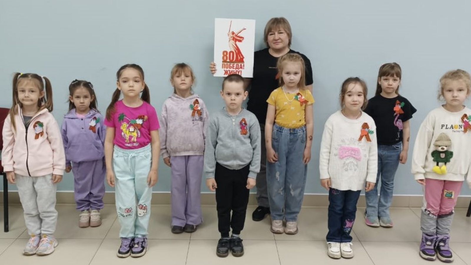 Балалар горурлык һәм истәлеккә хөрмәт белән киемнәрен Җиңү символы белән бизәделәр. Георгий лентасы-брошь җилдә балаларның курткаларында үскән.