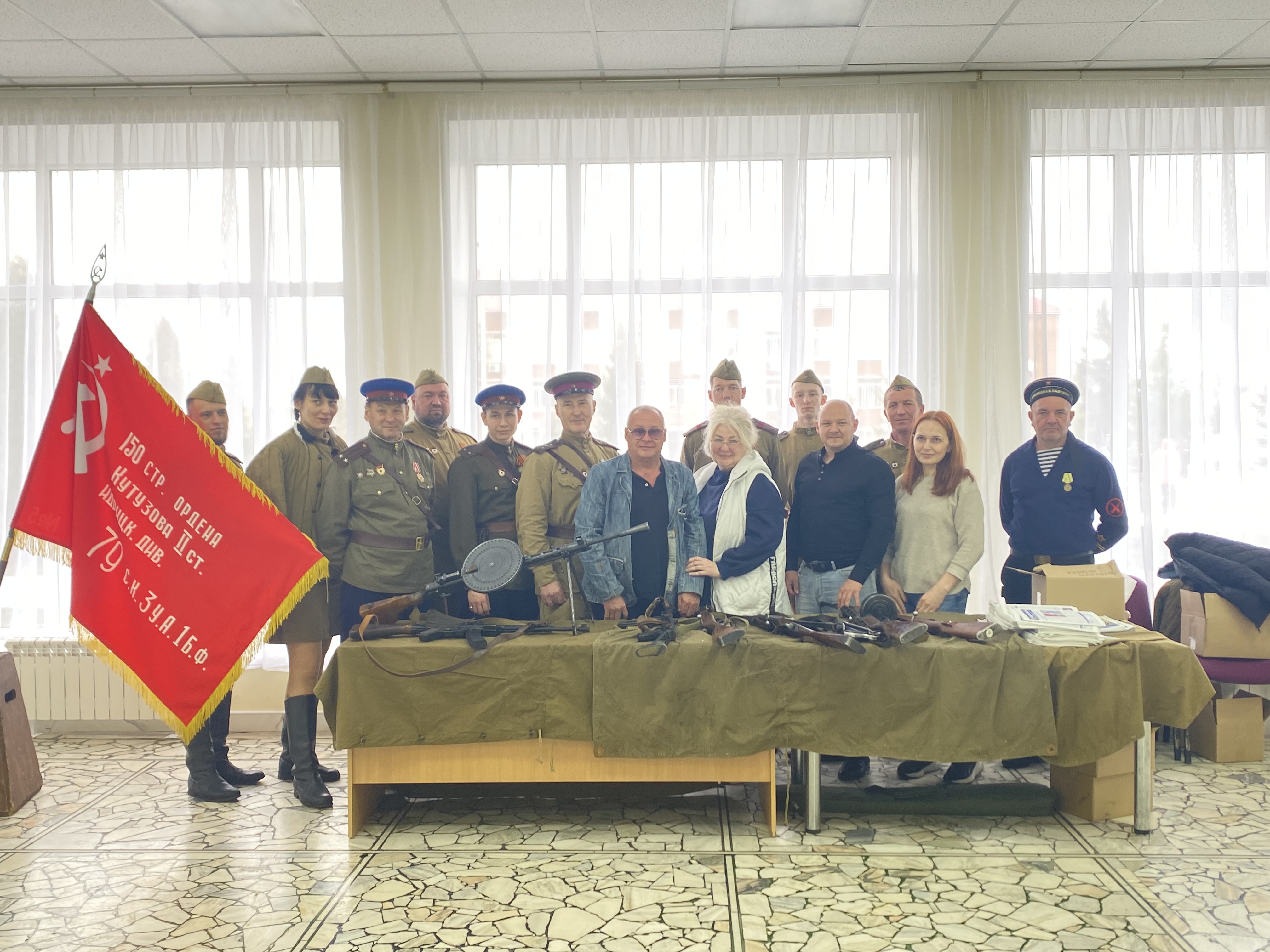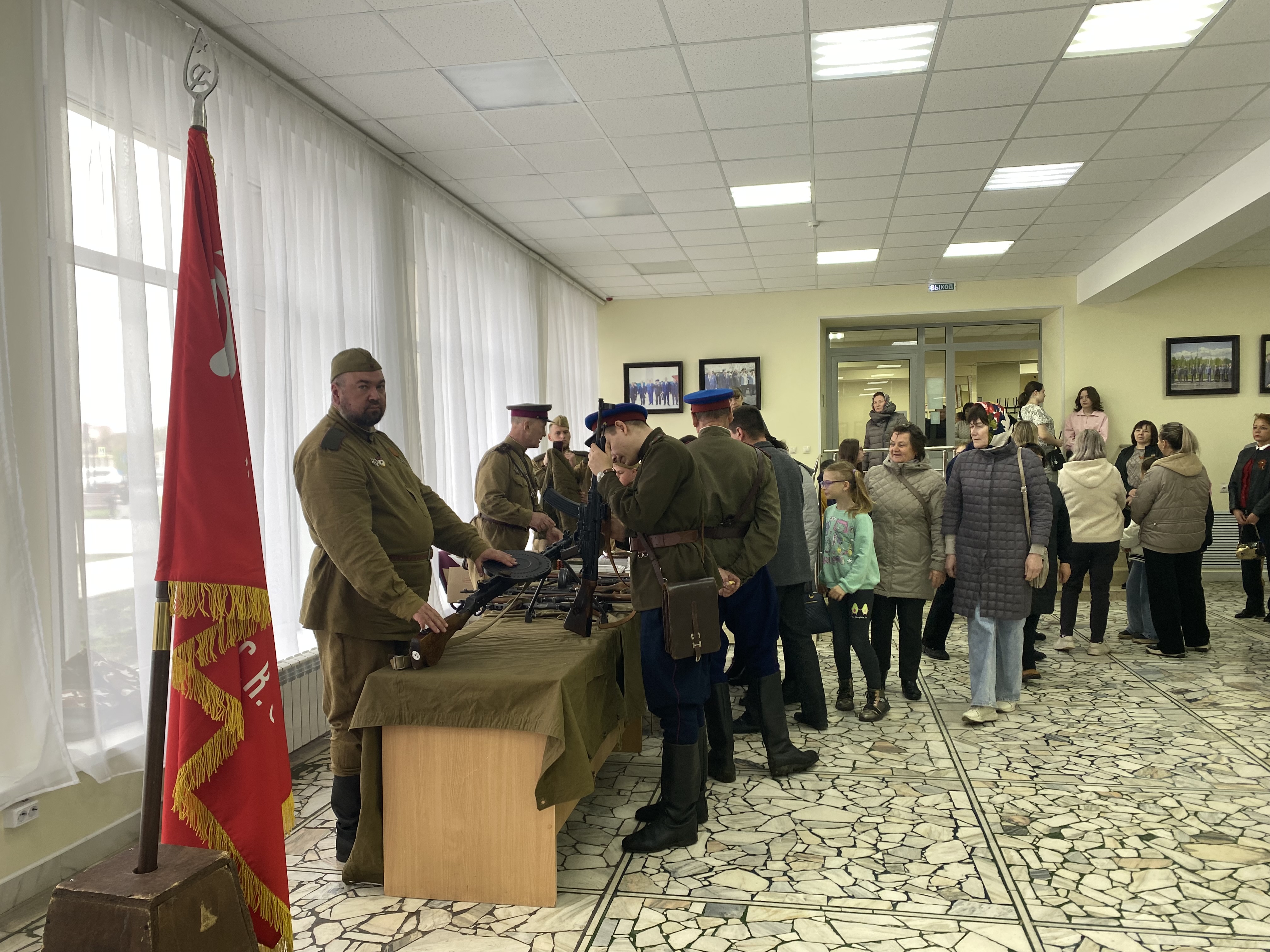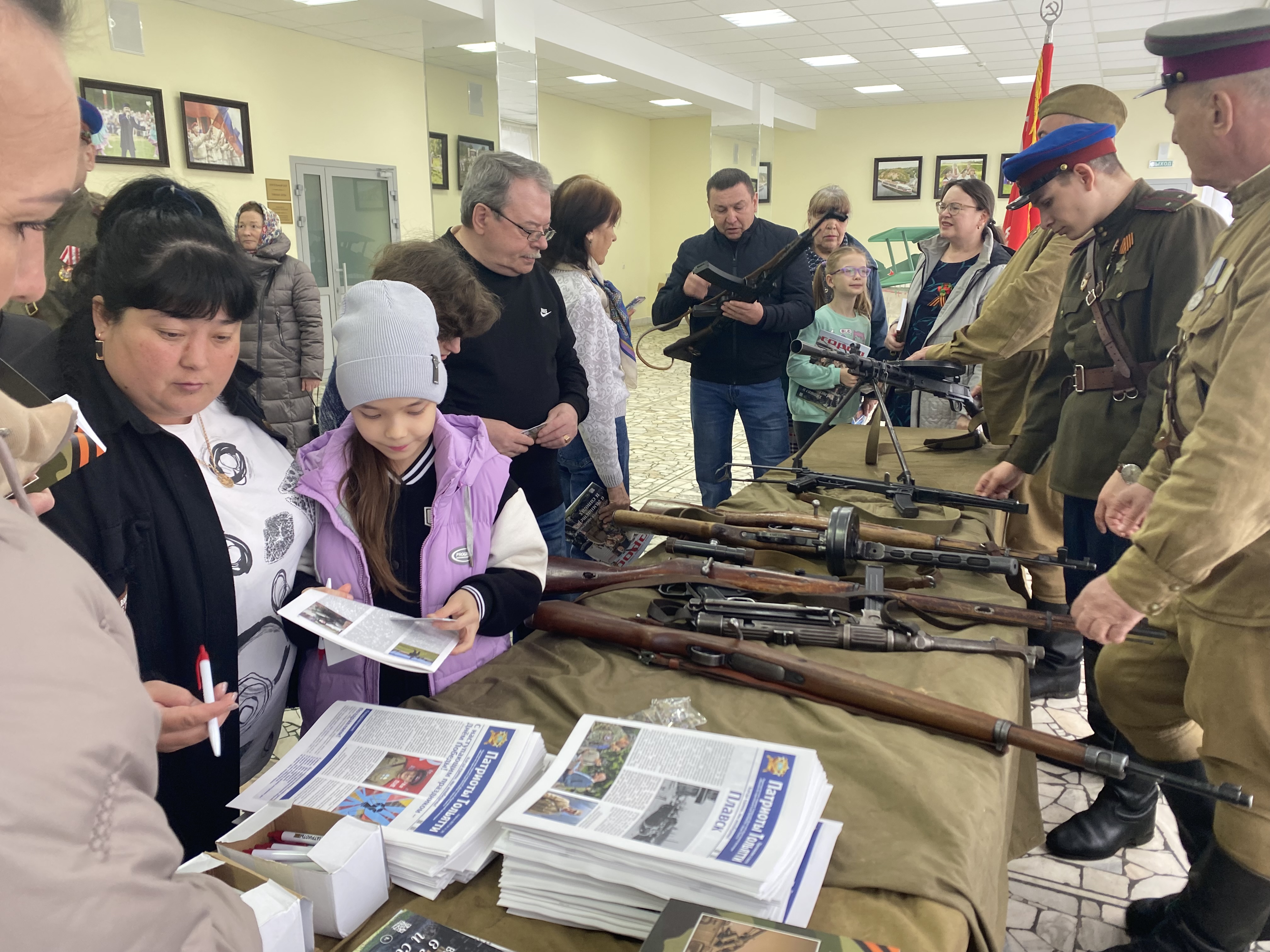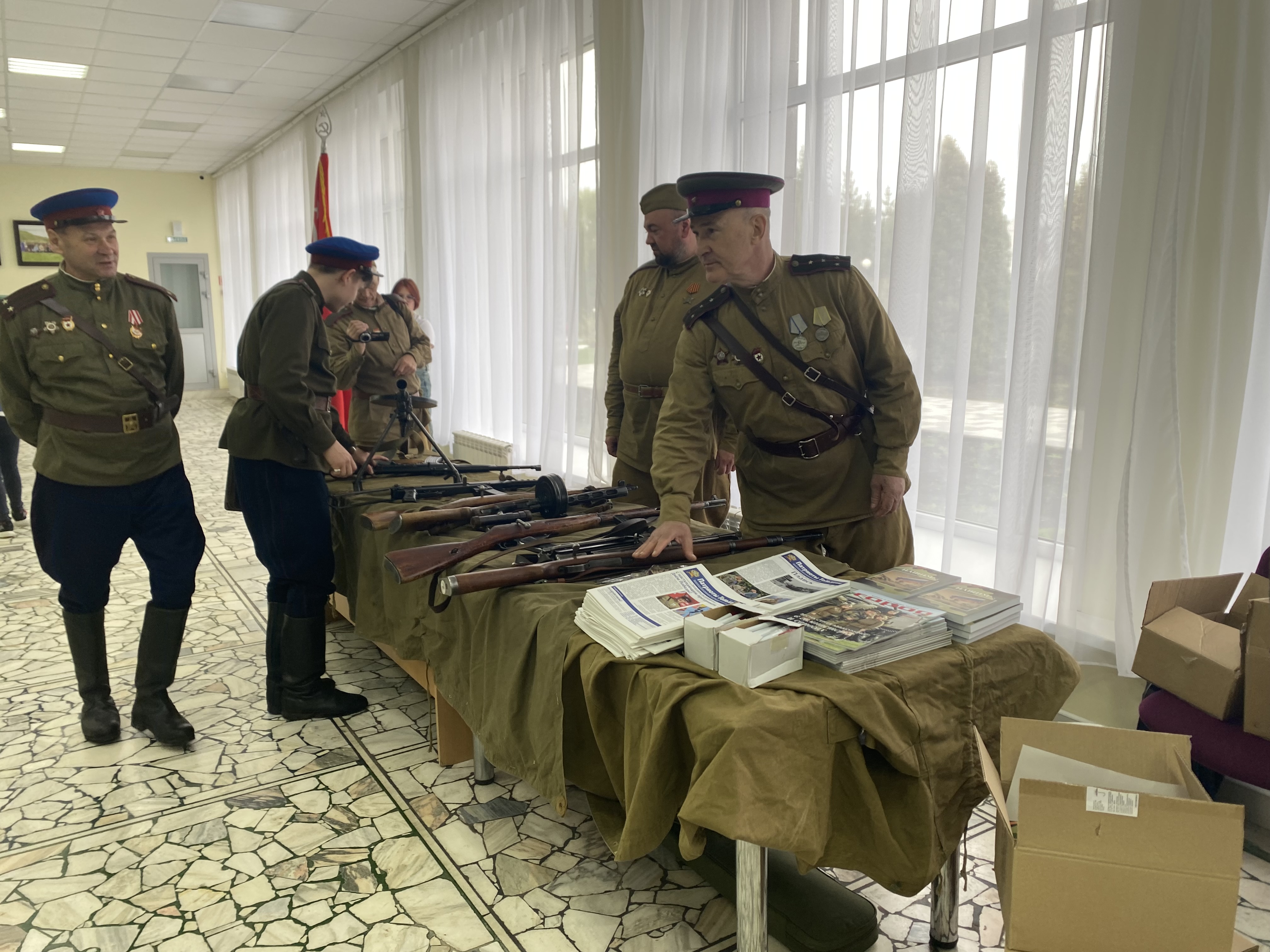 Район мәдәният йорты фойесында 1941-1945 еллардагы Бөек Ватан сугышы чоры коралларының интерактив күргәзмәсе тәкъдим ителде. Сәхнәдә «Патриотлар хәрби-тарихи клубы» оешмасы катнашучылары башкаруында рухи җырлар һәм шигырьләр яңгырады.