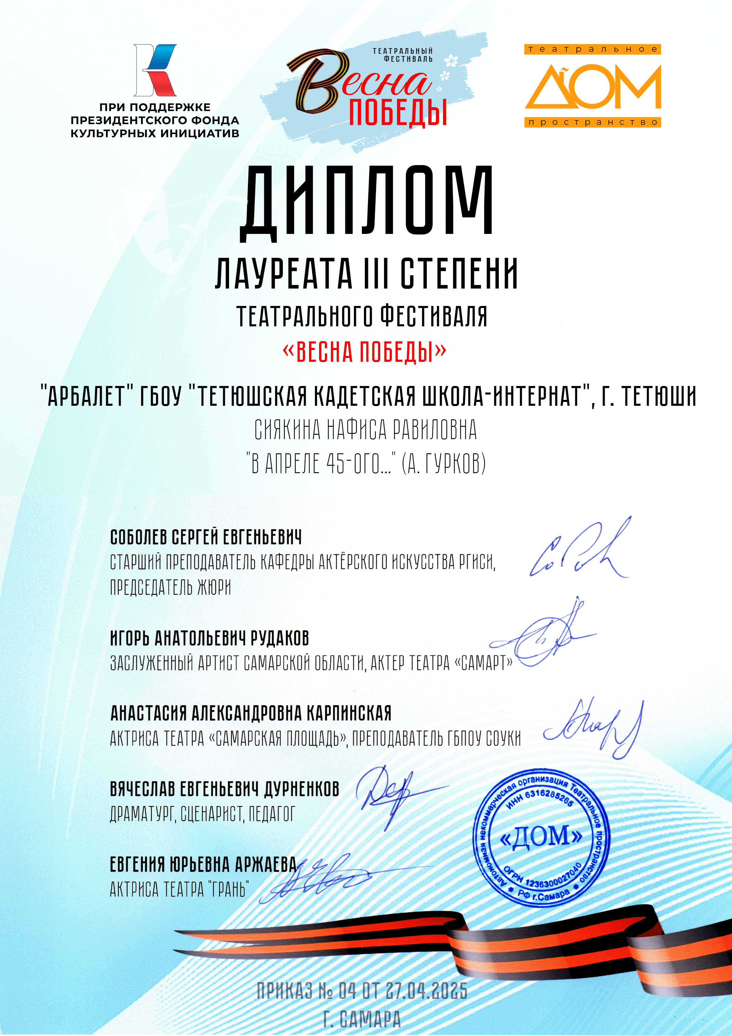 Тәтеш кадет интернат-мәктәбенең «АРБАЛЕТ» театры Җиңүнең 80 еллыгына багышланган күп кенә чараларда катнашты. Коллектив патриотик театраль тамаша белән Президент Мәдәни инициативалар фонды ярдәмендә Самара шәһәрендә уздырылган «Җиңү язы» I Бөтенроссия театр фестивалендә катнашты һәм «III дәрәҗә лауреат» Дипломы белән бүләкләнде.