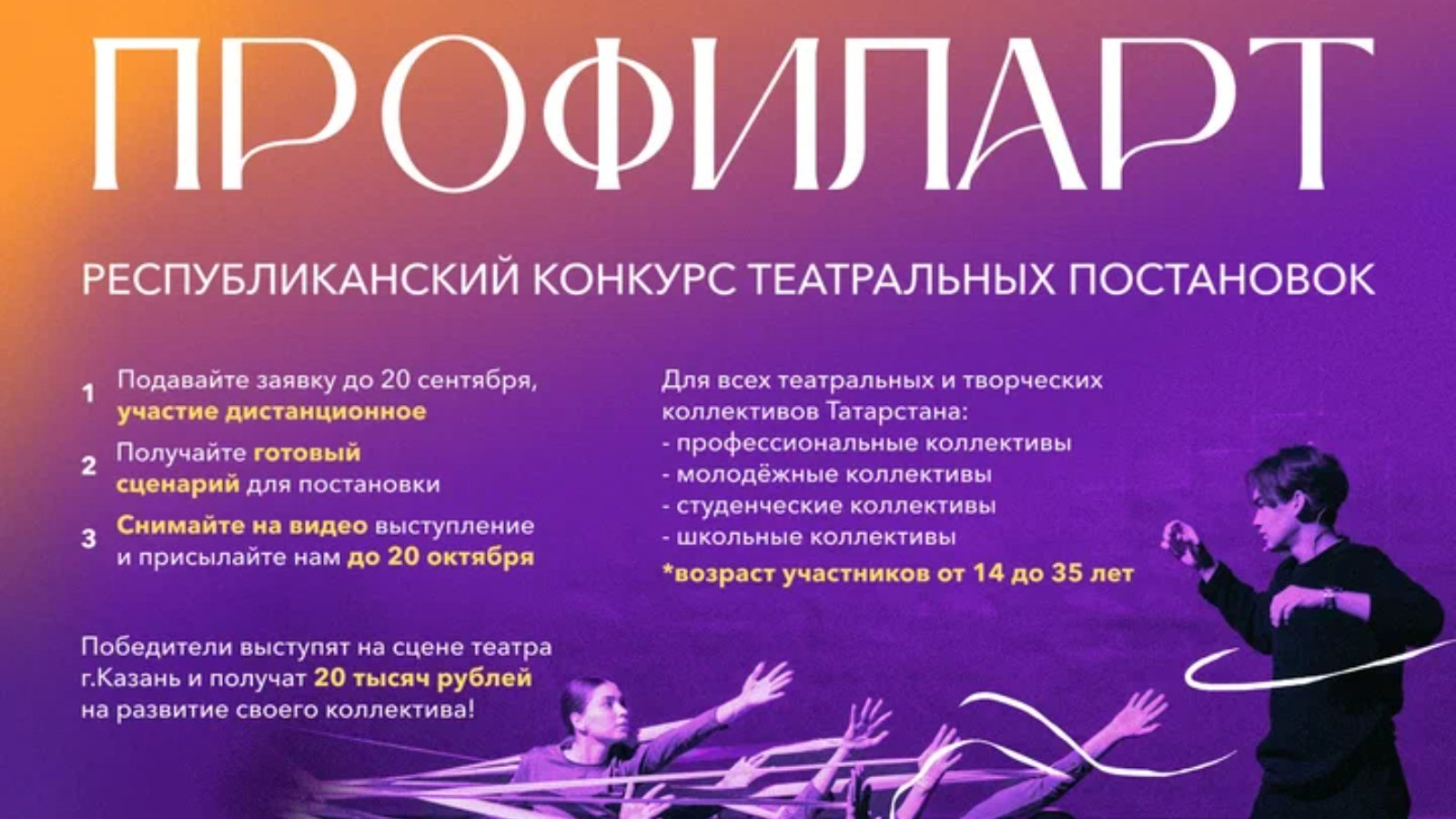 20 августта «ПрофилАрт» Республика театраль куелышлар конкурсының заявка кампаниясе старт алды, аның кысаларында бөтен республикадан килгән иҗат коллективлары социаль әһәмияткә ия темаларга бирелгән сценарий буенча театраль куелышлар ярышында катнаша алачак. Төп бүләк-Габдулла Кариев исемендәге Казан Татар дәүләт яшь тамашачы театрының Зур сәхнәсендә чыгыш ясау һәм коллективның һөнәри үсешенә 20 мең сум акча.