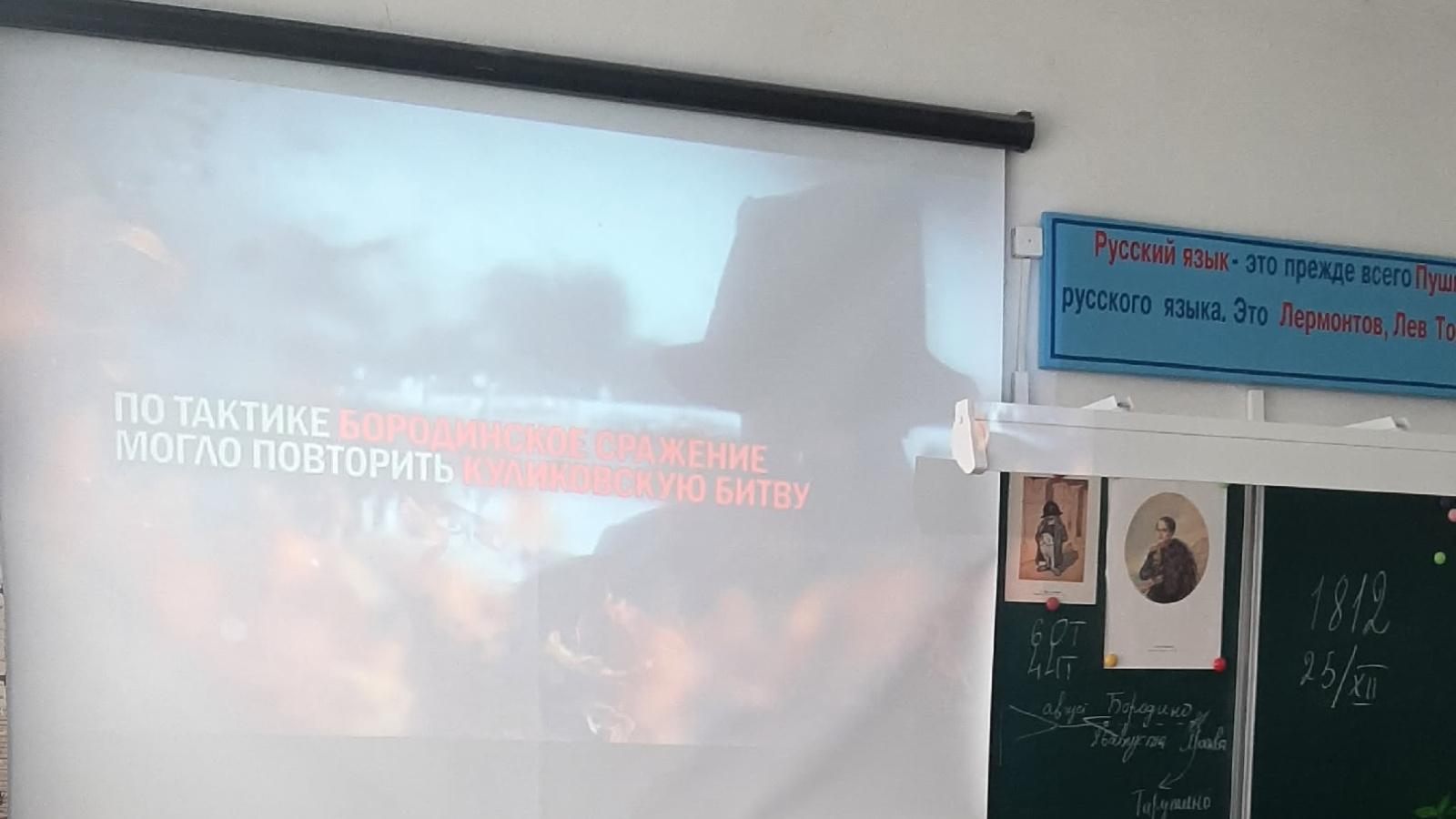 Истәлекле дата кысаларында мәктәптә Батырлык дәресе үткәрелде. Дәрес барышында укучылар М.И. Кутузов җитәкчелегендәге рус армиясе белән Наполеон гаскәрләре арасындагы генераль сугыш тарихы белән таныштылар.