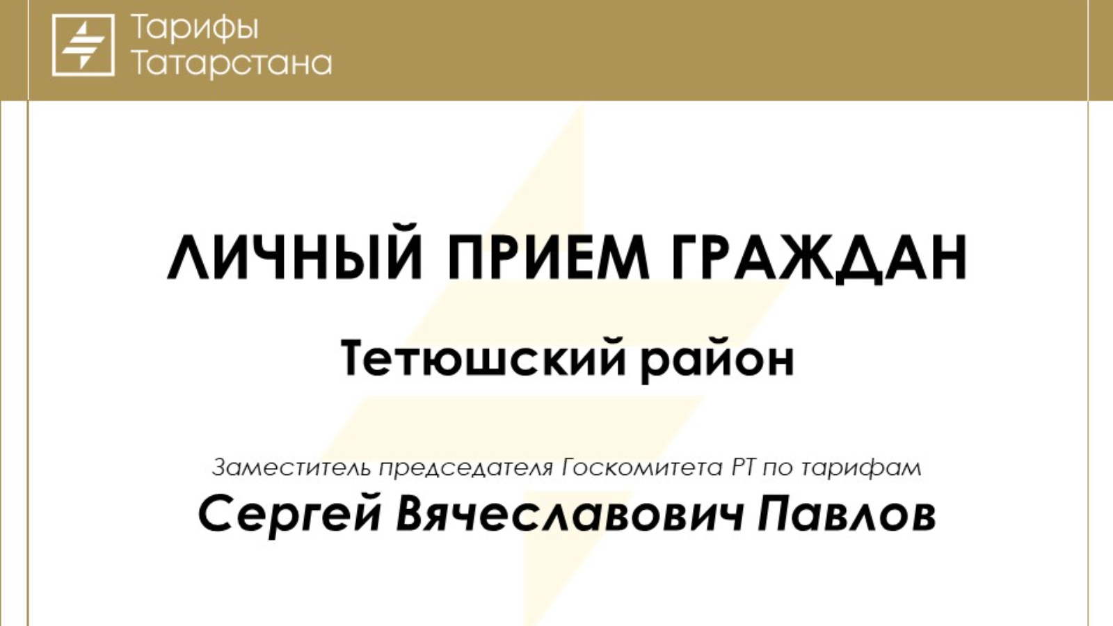 Сезне гражданнарны күчмә кабул итүдә катнашырга чакырабыз, аны Татарстан Республикасы Тарифлар буенча Дәүләт комитеты рәисе урынбасары Сергей Вячеславович Павлов үткәрәчәк.