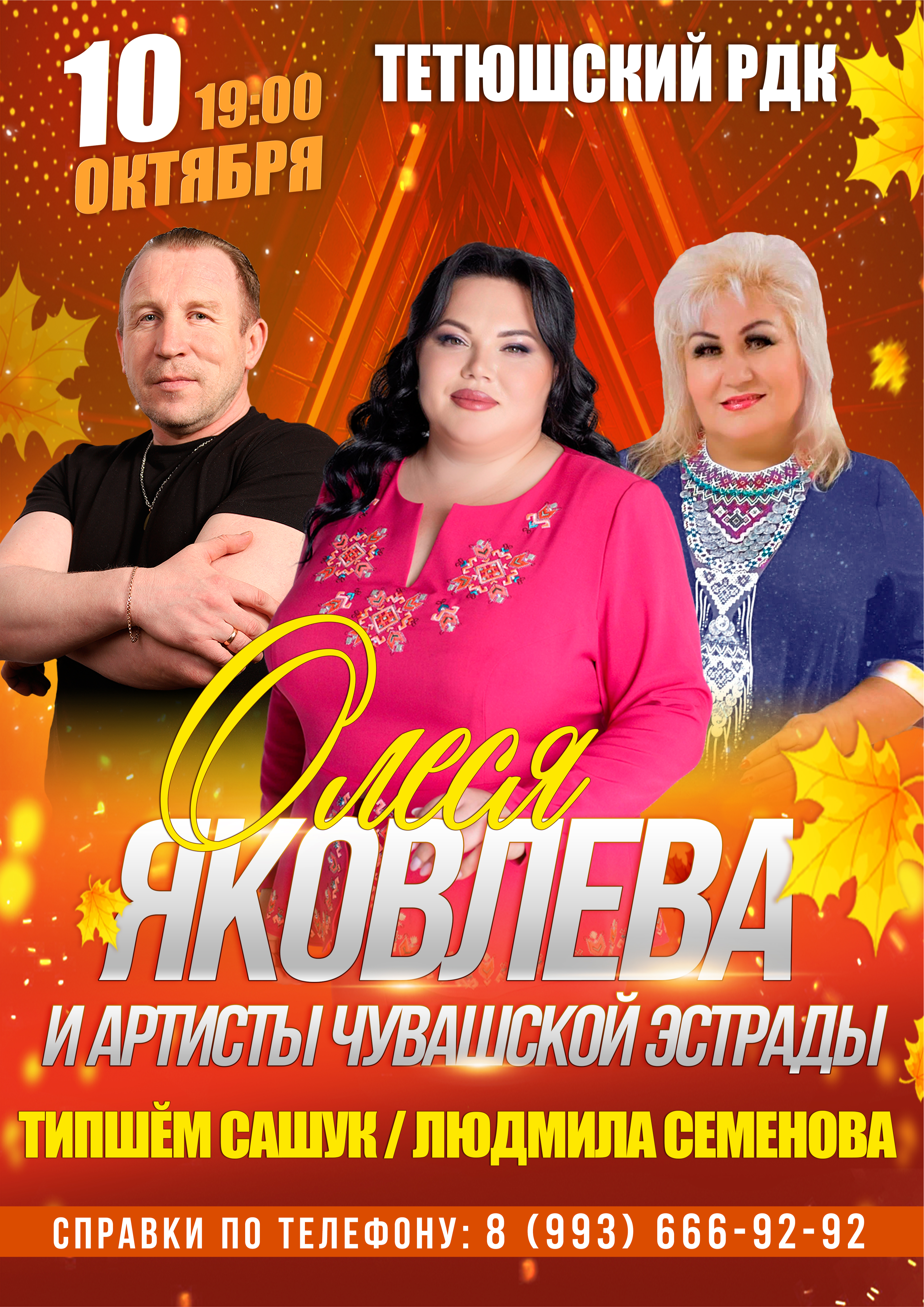 10 октябрьдә 19.00 сәгатьтә Тәтеш районы мәдәният йортында Олеся Яковлева, Людмила Семенова һәм Типшĕм Сашук катнашында чуваш эстрадасы артистлары концерты була.