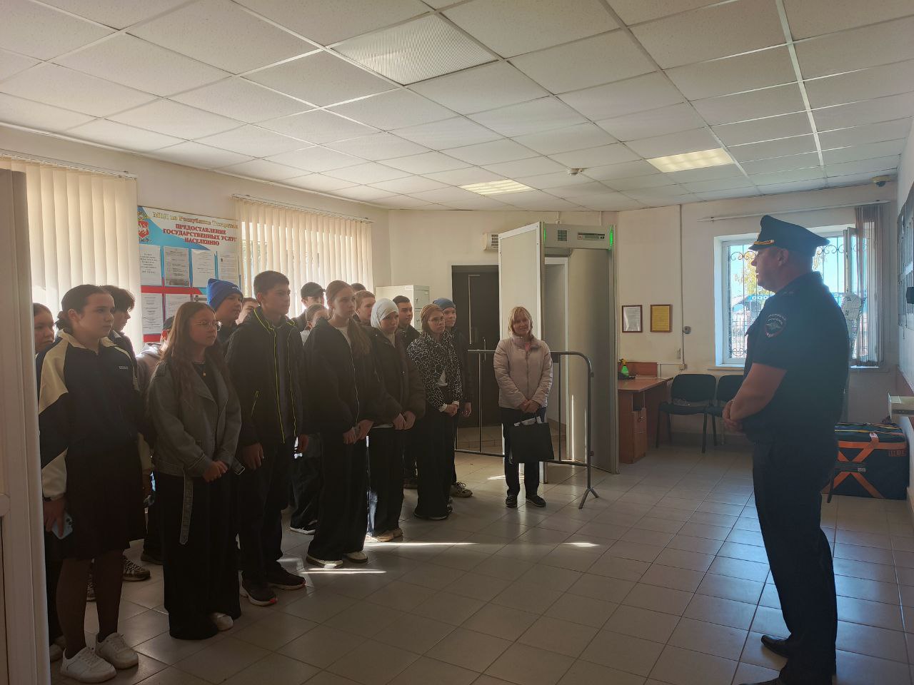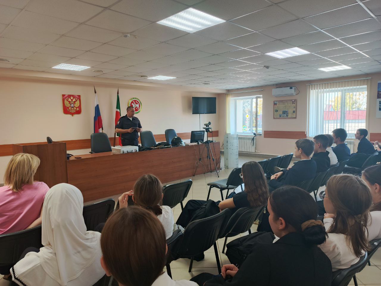 Мәктәп укучылары белән чираттагы экскурсияне Россия Эчке эшләр министрлыгының Тәтеш районы буенча Эчке эшләр бүлеге җитәкчесе урынбасары, полиция подполковнигы Д. Ю. Мельников үткәрде.