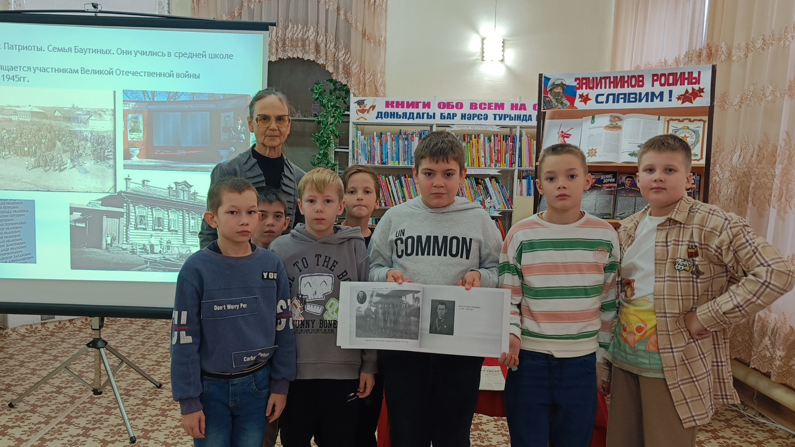 Балалар китапханәсендә Ватанны саклаучылар елы кысаларында Туган якны өйрәнүче, географ, төп Тәтеш кызы Милица Николаевна Иванова белән очрашу булды. Ханжина П.С., көзге каникуллар вакытында кечкенә ил мәктәп яны лагеренда, «Яшь Бөркетләр» сменасында булалар. Милица Николаевна данлыклы якташларыбыз – Баутиннар гаиләсе турында сөйләде. Укучылар бу гаиләдәге алты улының да, Бөек Ватан сугышында катнашып, данлыклы исемнәре булган атаклы кешеләр булуын белделәр. Аларның тормыш юлы горурлык һәм хөрмәт уята. Презентация слайдларында бу гаиләнең сирәк фотолары күрсәтелде. Очрашу азагында Милица Николаевна җирле шагыйрь һәм рәссам В.П. Араповның «Сугышның ахыры күптән килде...» дигән шигырен укыды.