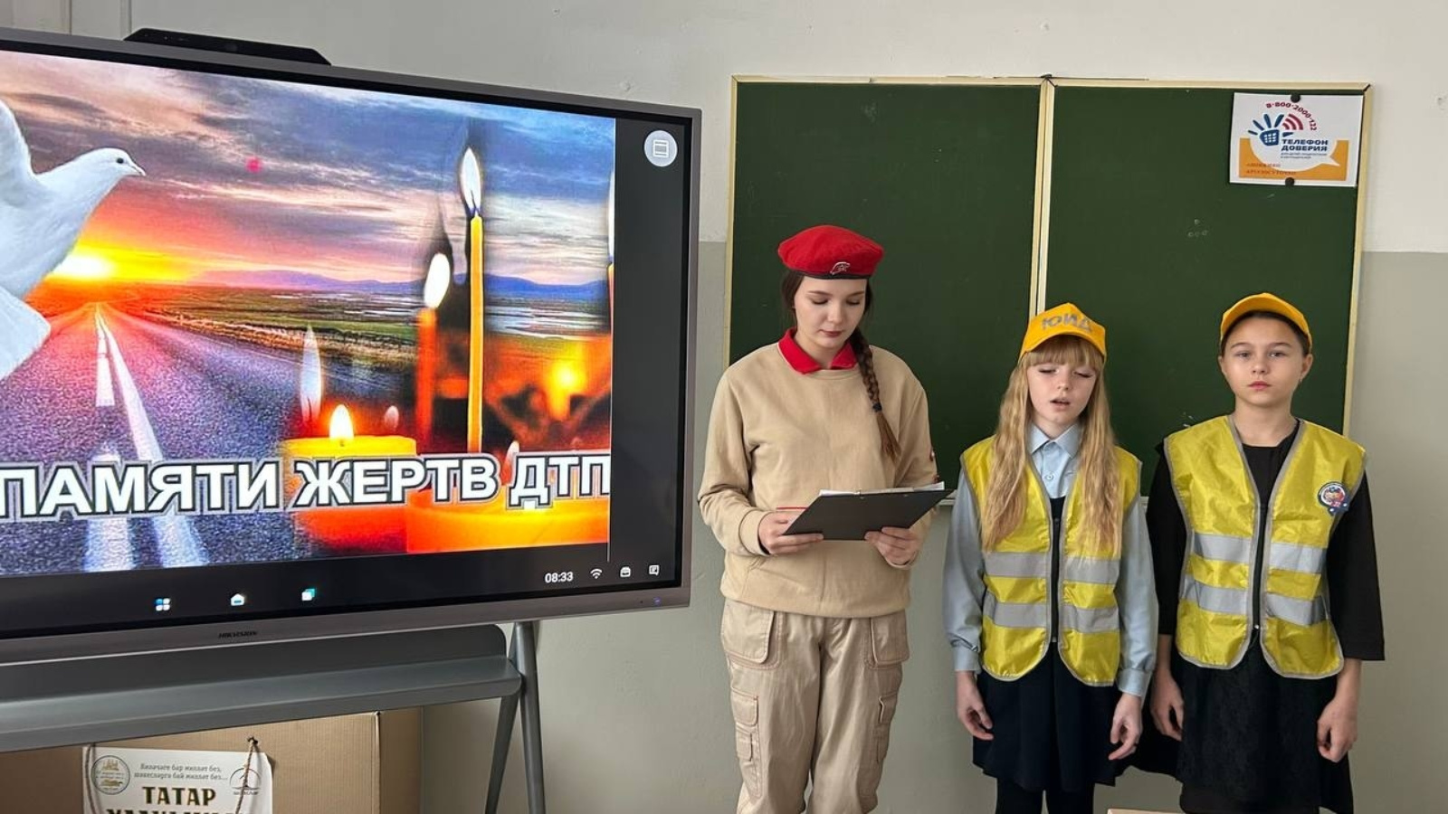 ЮИЮ хәрәкәтенең яшь инспекторлары өчен Г.Г. Преснова «Юл-транспорт һәлакәте корбаннарын искә алу көне» дәрестән тыш дәрес үткәрде. Гүзәл Гаяровна юл кырыенда үзеңне җаваплы тотарга кирәклеген һәм юлда куркыныч хәрәкәтләргә юл куелмавын ассызыклады. Яктылыкны кире кайтара торган элементларны куллануга аерым игътибар бирелде.