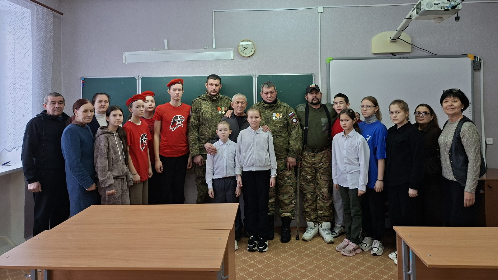 Безнең мәктәптә бик мөһим патриотик чара - мәктәпнең элеккеге чыгарылышлары, ә бүгенге көндә махсус хәрби операциядә катнашучы егетләр белән очрашу узды.