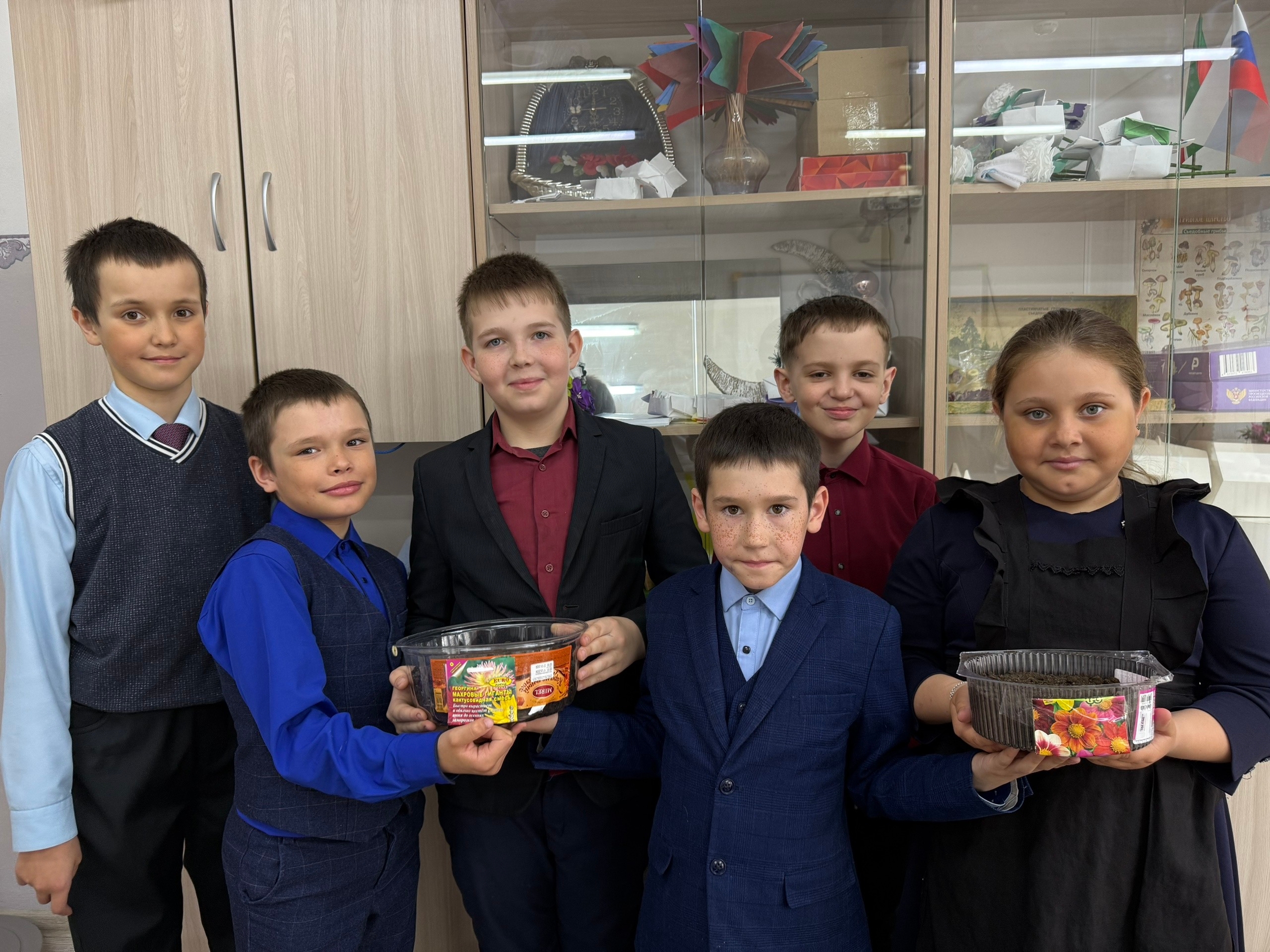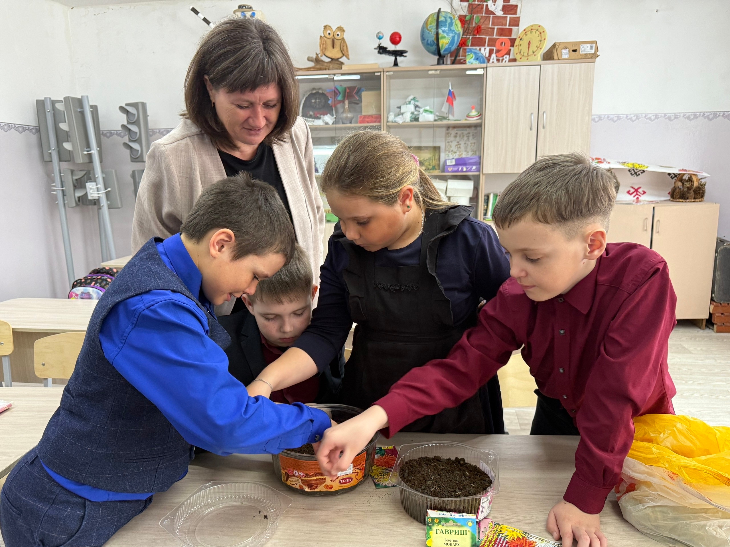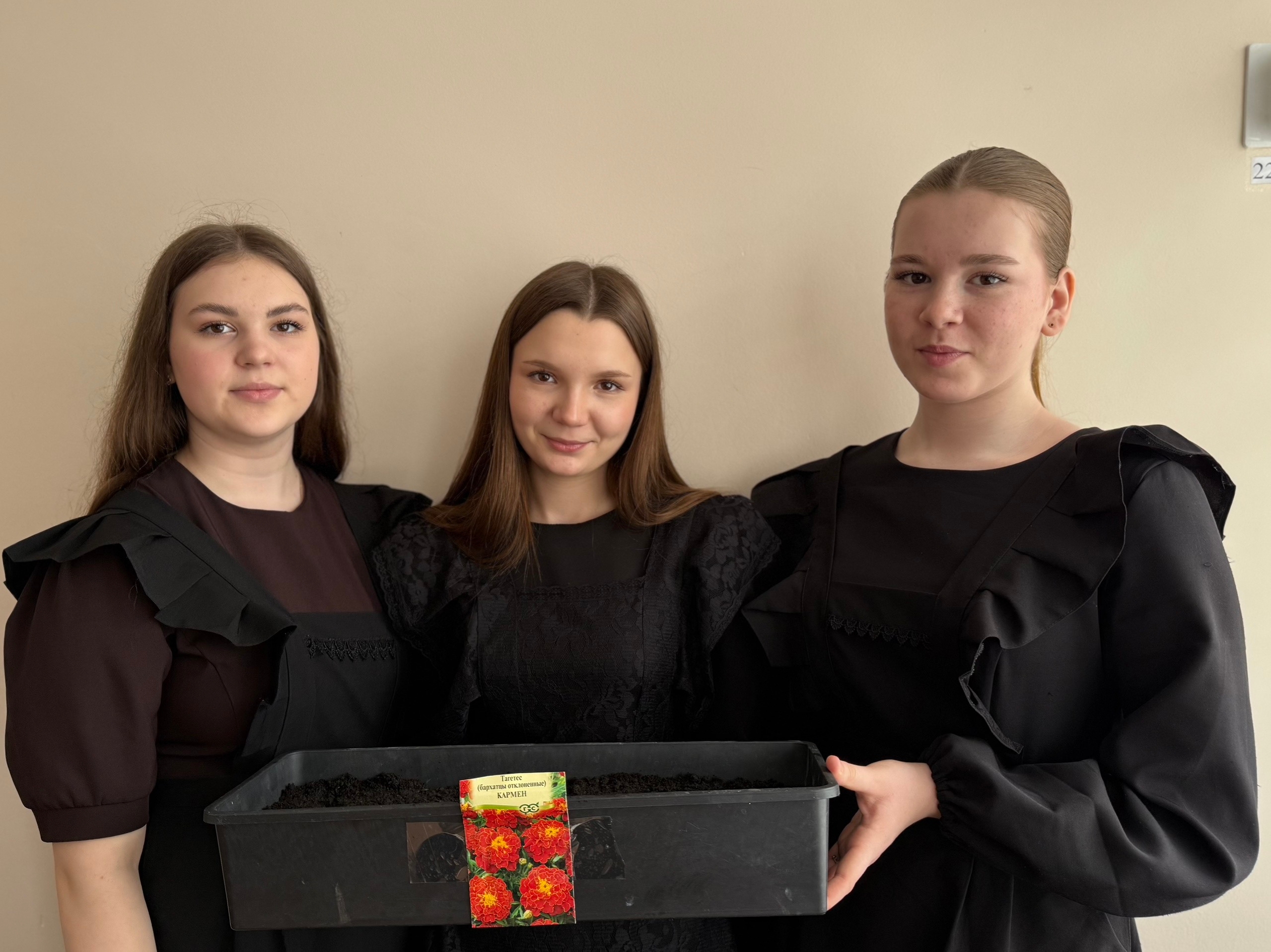 Өлкән сыйныф укучылары, сыйныф җитәкчеләре Преснова Г. Г., Кислова Н. П., Королева Е. А. һәм тәрбия буенча директор киңәшчесе Игнатьева А. С. белән берлектә укучылар үсентеләр өчен чәчәк орлыклары утырттылар.