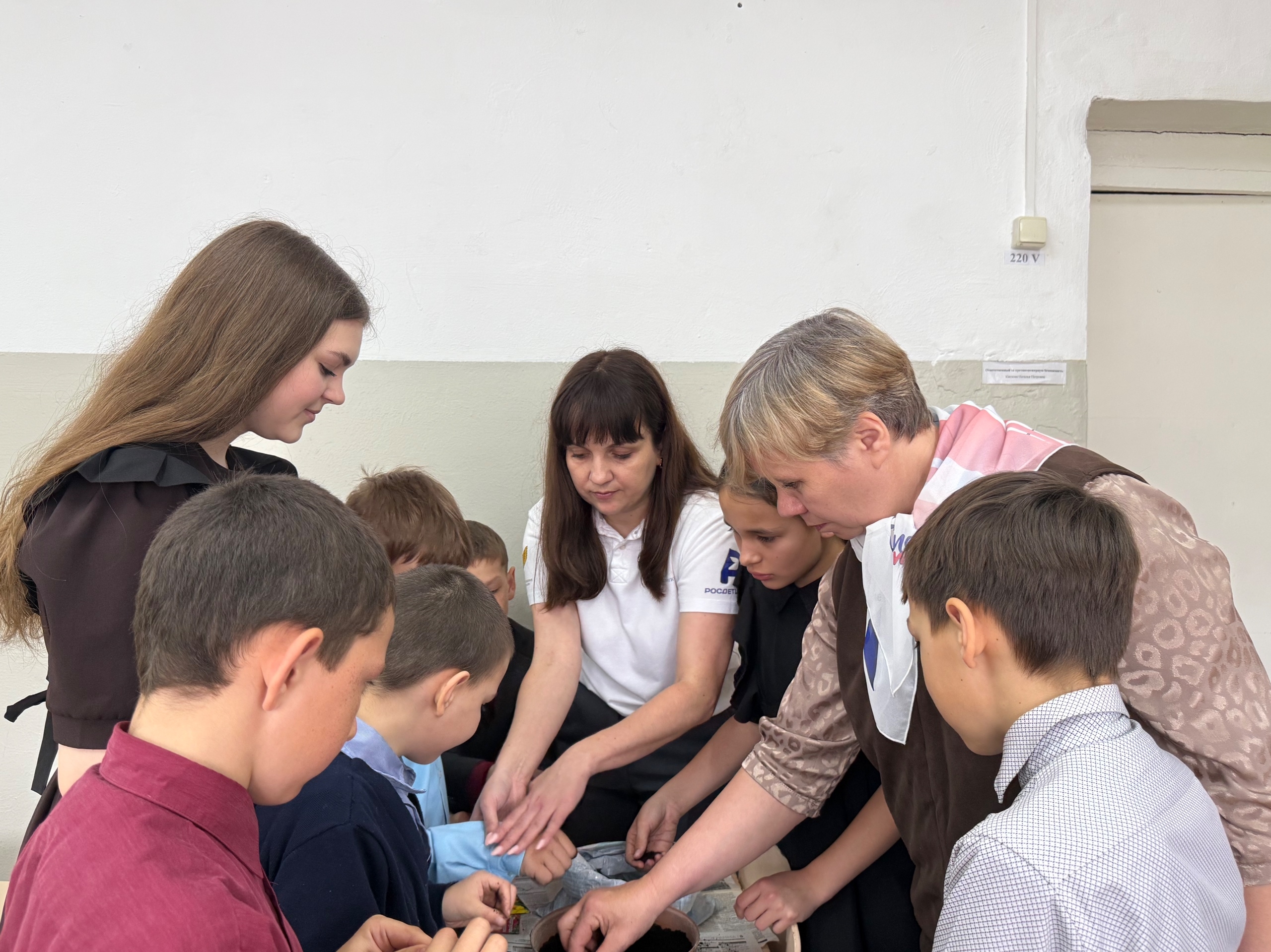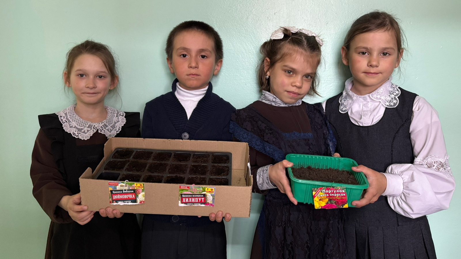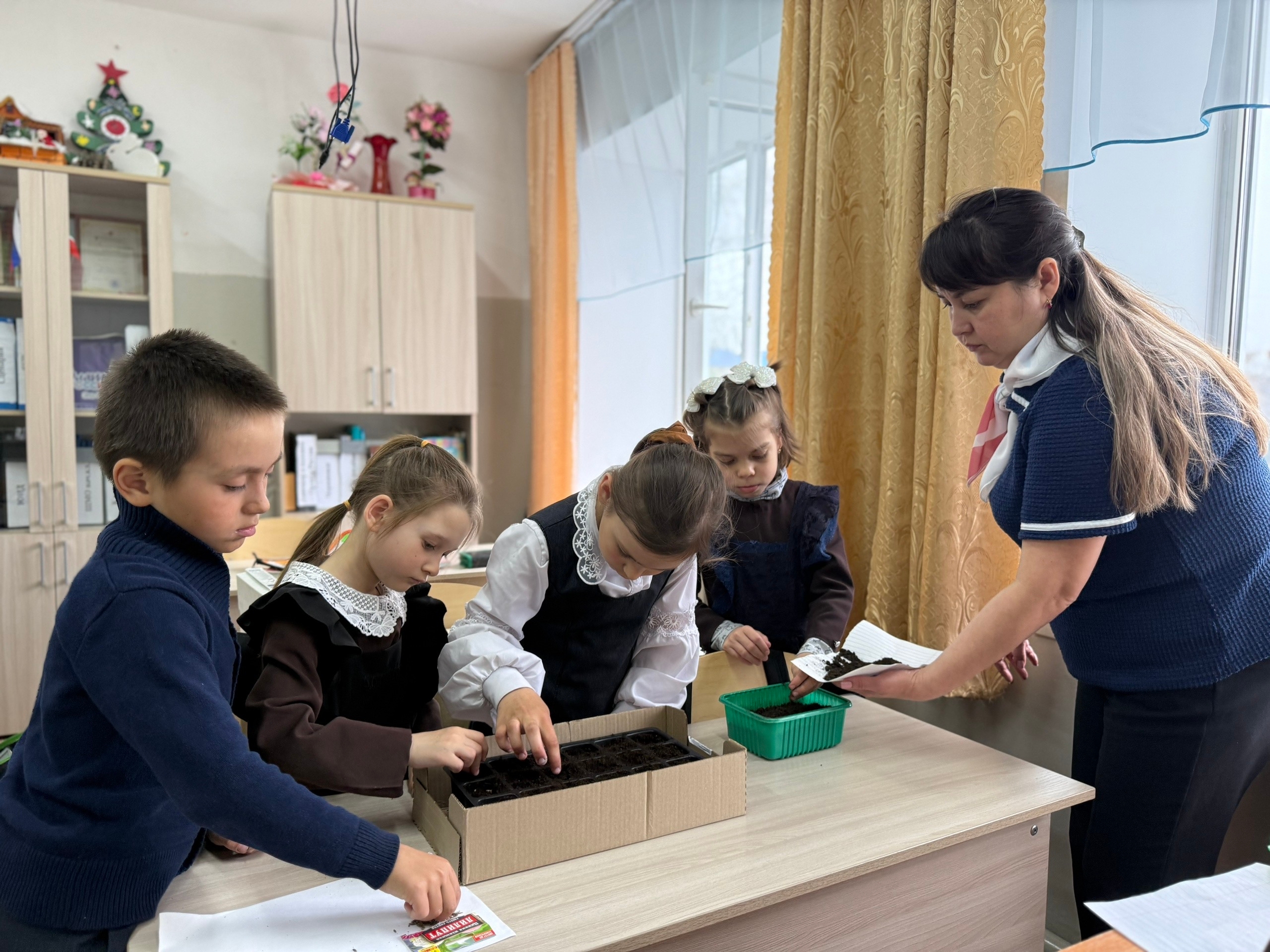 Өлкән сыйныф укучылары, сыйныф җитәкчеләре Преснова Г. Г., Кислова Н. П., Королева Е. А. һәм тәрбия буенча директор киңәшчесе Игнатьева А. С. белән берлектә укучылар үсентеләр өчен чәчәк орлыклары утырттылар.