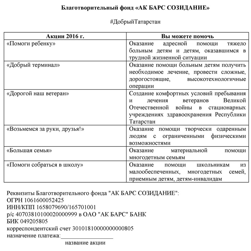 Күп еллар агымында Татарстан Республикасында уңышлы рәвештә хәйрия фонд «АК БАРС СОЗИДАНИЕ» үз эшен дәвам итә. Фонд рәисе Татарстан Республикасы Президенты Рөстәм Миңнеханов.