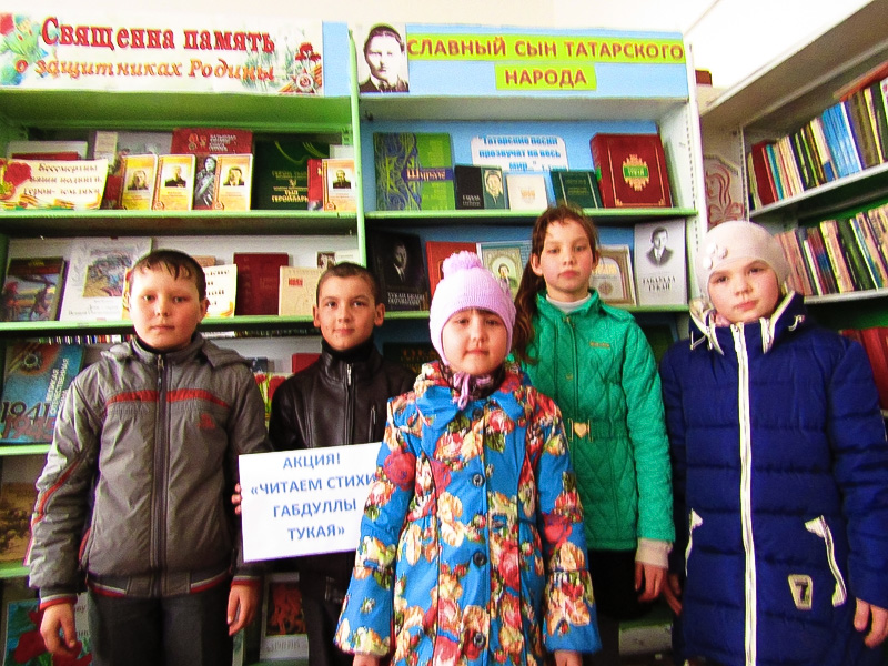 В преддверии 130-летия со дня рождения великого поэта, славного сына татарского народа Габдуллы Тукая в Иоковской библиотеке состоялся ряд мероприятий, посвящённых этой замечательной дате. Была объявлена акция "Читаем стихи Габдуллы Тукая", оформлены книжно-иллюстрированная выставка-посвящение "Славный сын татарского народа", альбом "Габдулла Тукай (1886-1913)". 12 апреля проведён литературно-поэтический урок с учащимися начальных классов "Читаем стихи Тукая". Библиотекарь Раиса Матюшина рассказала детям о короткой, но яркой , плодотворной жизни великого поэта. Также состоялся обзор выставки, дети ознакомились с альбомом о творчестве Тукая. В конце мероприятия детям были предложены книги Г. Тукая для чтения в семейном кругу.