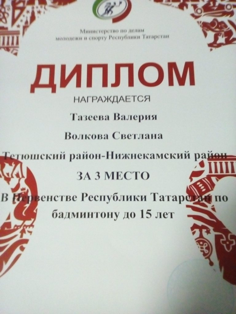 18-19 марта в Центре бадминтона г. Казани прошло первенство Татарстана до 15 и до 19 лет. Сборная Тетюшского района составленная из воспитанников ДЮСШ приняла участие в количестве 15 человек и показала достойный результат, где многие спортсмены выполнили норматив 3-его взрослого разряда. Лучшего результата добилась Тазеева Валерия, которая как и неделей ранее на других соревнованиях завоевала бронзовую медаль в женском парном разряде.