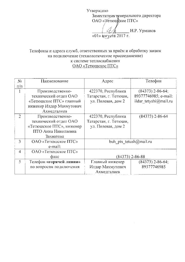 Телефоны ответственных и горячей линии на подключение к системе теплоснабжения ОАО "Тетюшское ПТС"