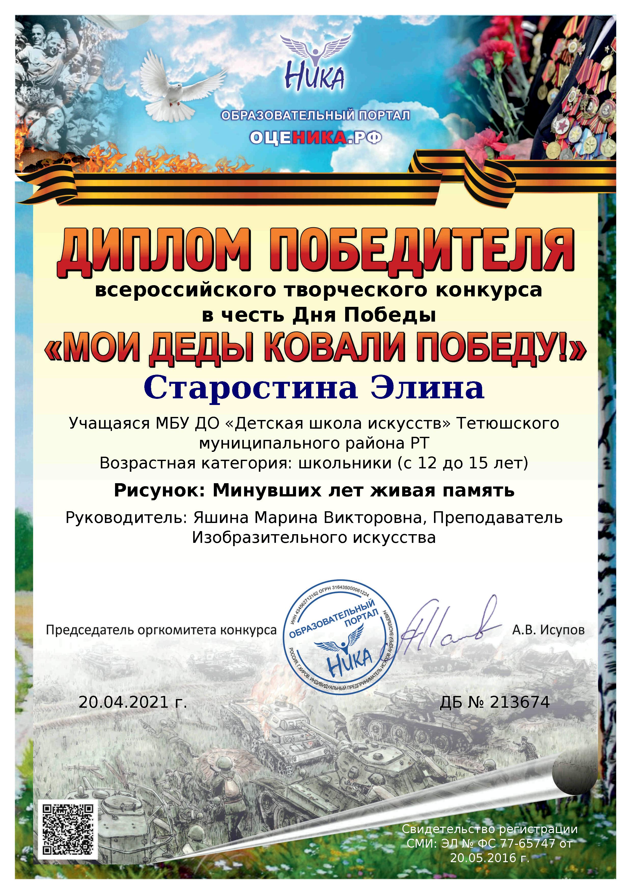 С 10 по 25 апреля 2021 года учащаяся Детской школы искусств художественного отделения Старостина Элина под руководством преподавателя Яшиной М.В. приняла участие во Всероссийских творческих конкурсах исполнительского мастерства: «Мои деды ковали Победу» и «О Родине, о мужестве, о славе». Цель конкурсов: сохранение памяти о важнейших событиях в истории нашей страны; пропаганда патриотических духовных ценностей, национальной гордости, реализация творческих способностей, выявление талантливых детей. Конкурсы проводились по соответствующим возрастным группам. В результате, по итогам конкурсов, в номинации: "Рисунок», «Изобразительное, фото, видео искусство» в номинации «Живопись и графика" Старостина Элина (1 класс ДШИ) награждена Дипломом Победителя и Дипломом за I место. Элина представила на конкурсы творческие работы по темам: «Минувших лет живая память» и «Горячий Кандагар». Поздравляем!